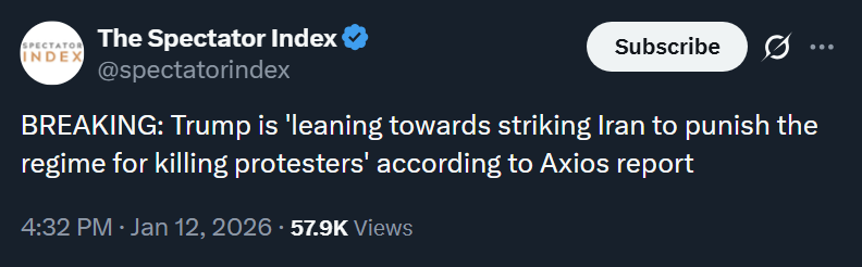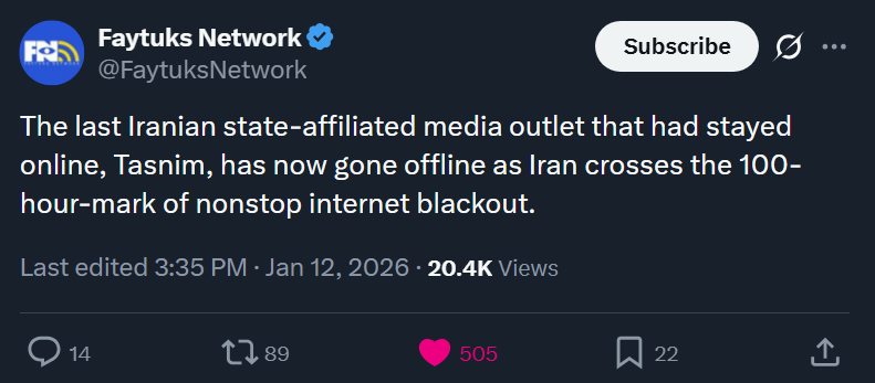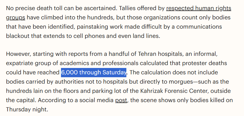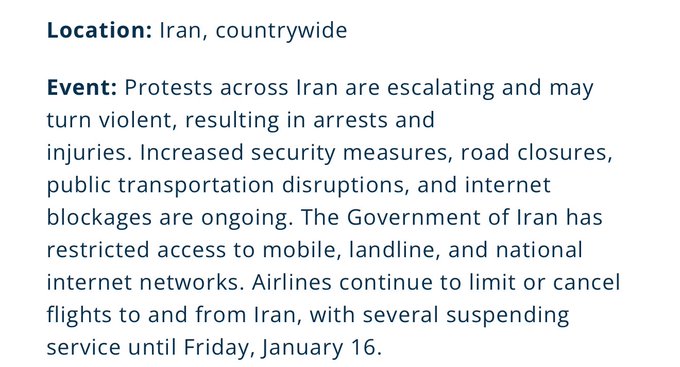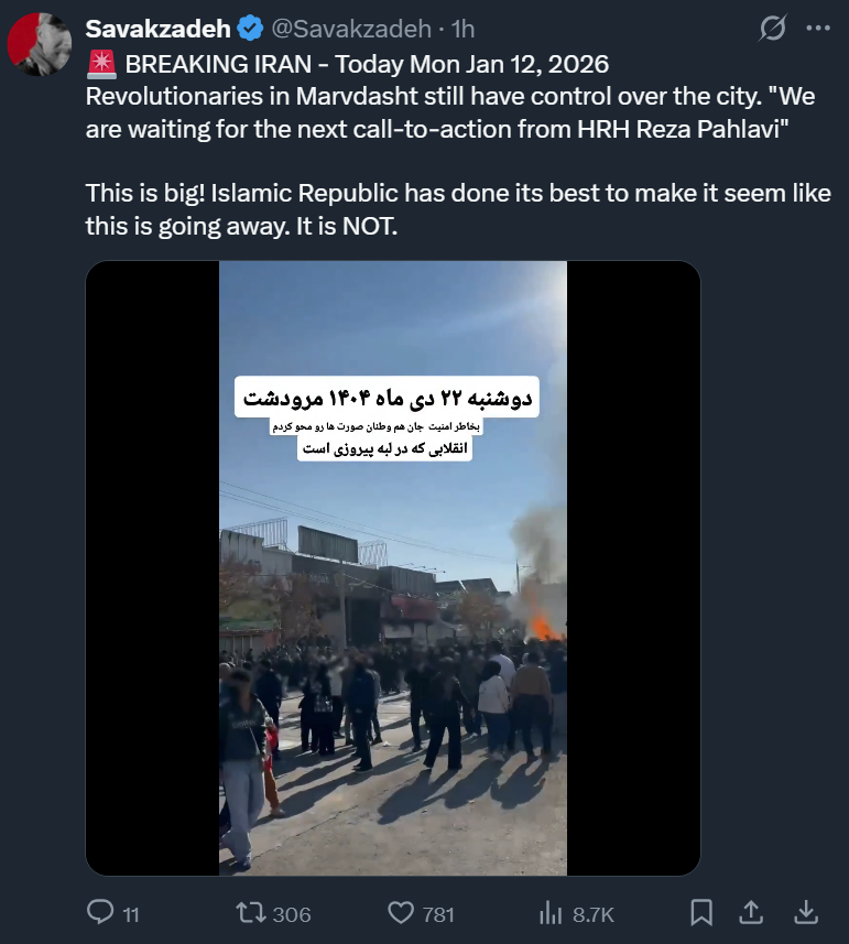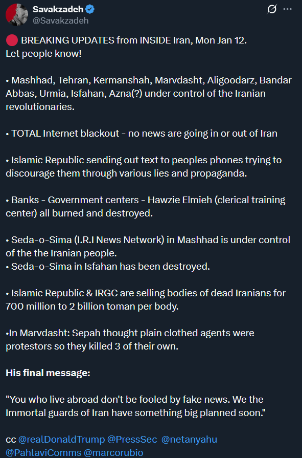 Last: >>525839598Daily discussion of the ongoing situation in Iran.Jan 12:>internet still blocked after 96 hours>Heavy govt crackdown in Isfahan tonight, live ammunition being used - FOX>Trump leaning towards military strikes, with Vance leaning towards talks - WSJ>protests again tonight in Tehran>pro-govt rallies were organized todayJan 11 and before:>protests have reached over 180 cities total>every major city has or is experiencing protests>Lowshan was "in the hands of the people" until yesterday when the military showed up in force and violently dispersed the protests -BBC Persian>protestors are back in the streets as of Sunday night>at least 500+ dead according to activists - AP>estimated thousands of protestors dead, unverified source says over 20k likely dead>dozens of police dead during clashes, Islamic regime using machine guns to surpress crowds>complete network blackout cell/internet>Govt is cracking down on satellites and starlink terminals.>Trump: Iran is starting to cross it [my red line]. There seems to be some people killed that aren't supposed to be killed. We are looking at it very seriously, the military is looking at it and we're looking at some very strong options>Donald Trump to be presented with options on how to handle Iran on Tuesday - WSJhttps://xcancel.com/alexbward/status/2010381167246327854 (embed)>Israel is on high-alert for a US intervention possibly happening soonhttps://www.reuters.com/world/middle-east/israel-high-alert-possibility-us-intervention-iran-sources-say-2026-01-11/>no action yet, a complete silence and lack of credible info due to prolongued blackoutTonight we might see US strike Islamic regime of Iran.Iran Newshttps://www.aparatchi.com/iran-live-tv/farsi-irib-tv/shabakeh-khabar-liveXitterhttps://truthsocial.com/@realDonaldTrumphttps://x.com/khamenei_irhttps://x.com/WW3_MonitorMapshttps://www.flightradar24.com/airport/thrhttps://iran.liveuamap.com/