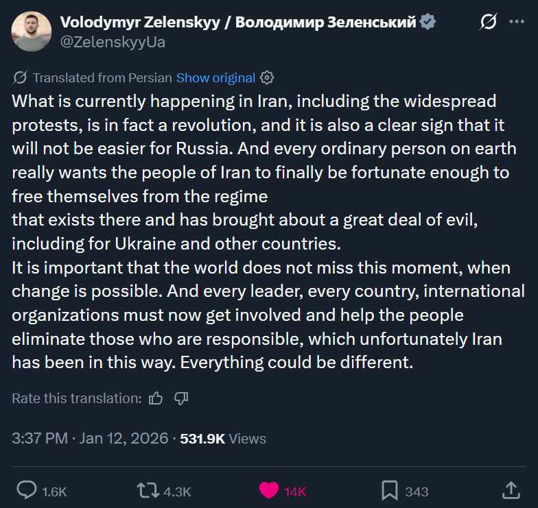 https://x.com/EmmanuelMacron/status/2010790967004316005?s=20>I condemn the state violence that blindly targets Iranian women and men who are courageously demanding respect for their rights.>Respect for fundamental freedoms is a global demand, and we stand alongside the women and men who defend it.How brave of France to condemn violence and support freedom. They stand alongside revolutionaries on X. That is indeed sufficient to effect change in the real world. Nothing is more powerful than words, after all.