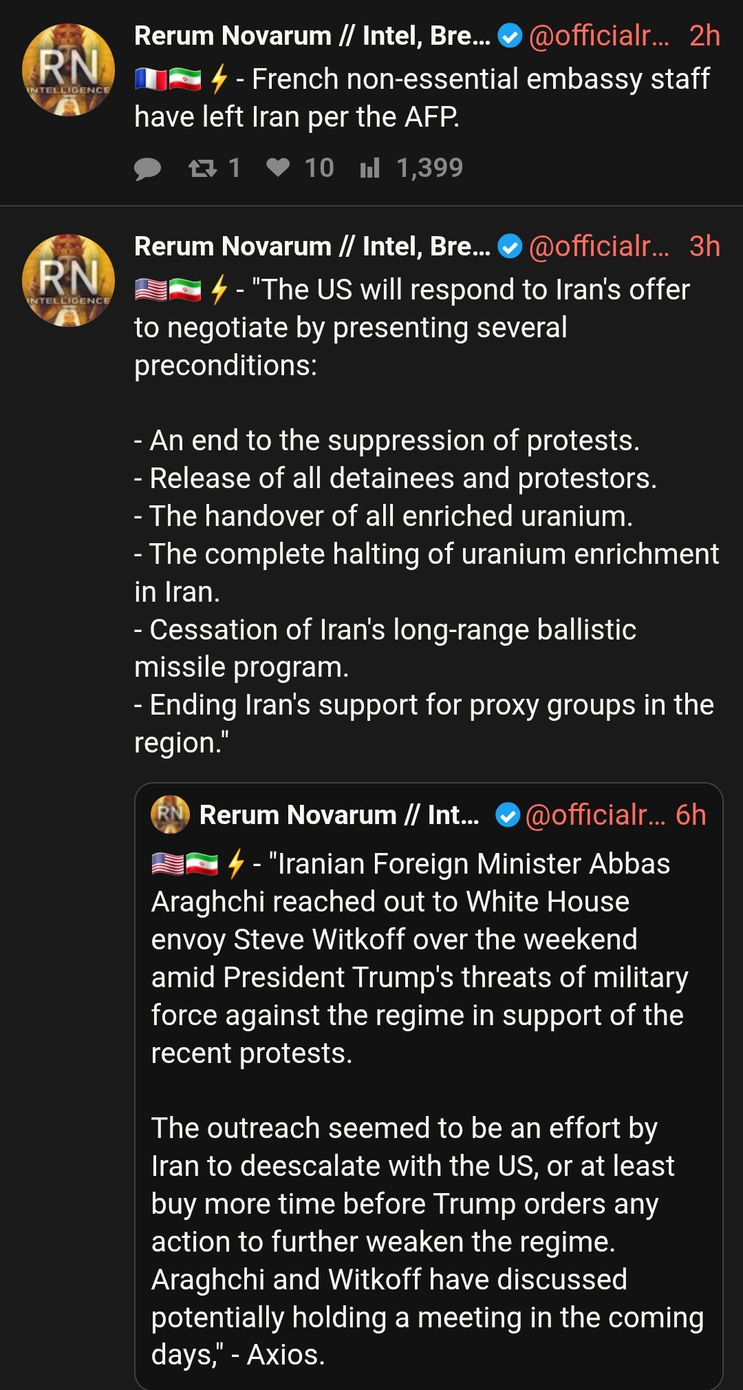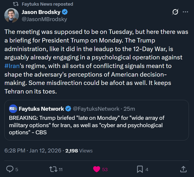 I personally hope that Trump has decided on military intervention, but it might not happen until later this week. Meanwhile he obviously doesn't want to publicly reveal that he is planning military action, because then Iran will be able to prepare if not launch a preemptive strike. I hope the negotiations talk with Vance is just a ruse to keep the regime off guard, and America doesn't care about the substance of any negotiations. Let's hope he'll launch a surprise attack soon and then the Iranian Liberation can occur in earnest!