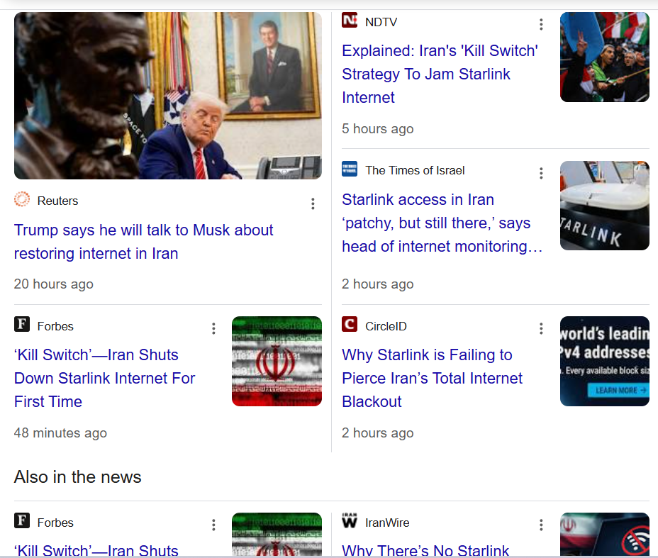 >>525855011>Has there been a time in recent history where cutting communications in times of country-wide protests doesn't result in even larger and angrier protests?yes. June 2025 in Iran 12 day war.