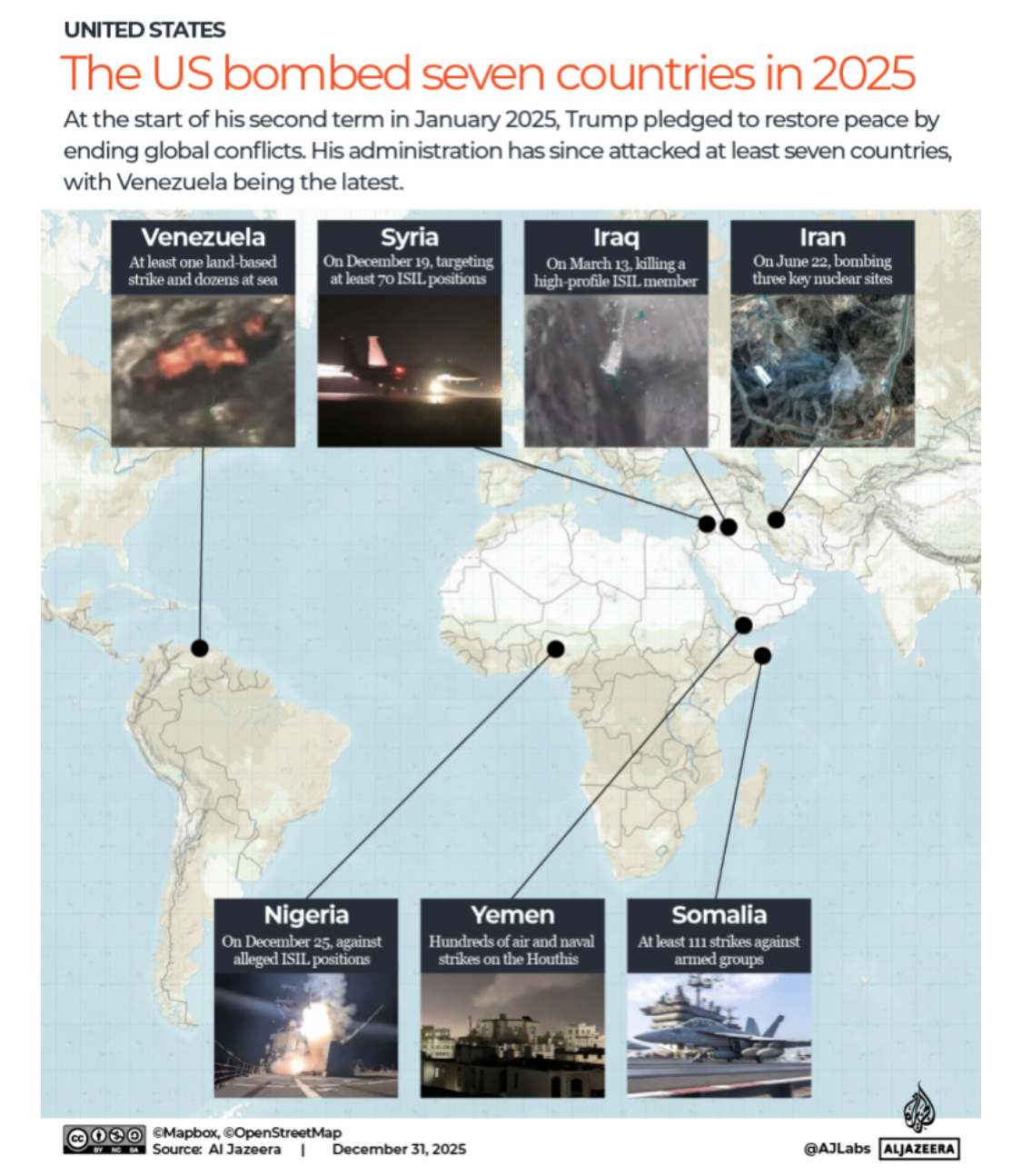 >Overall, at least 111 strikes have been recorded this year, surpassing the number carried out under the George Bush, Barack Obama, and Joe Biden administrations combinedhttps://www.aljazeera.com/news/2025/12/31/how-many-countries-has-trump-bombed-in-2025