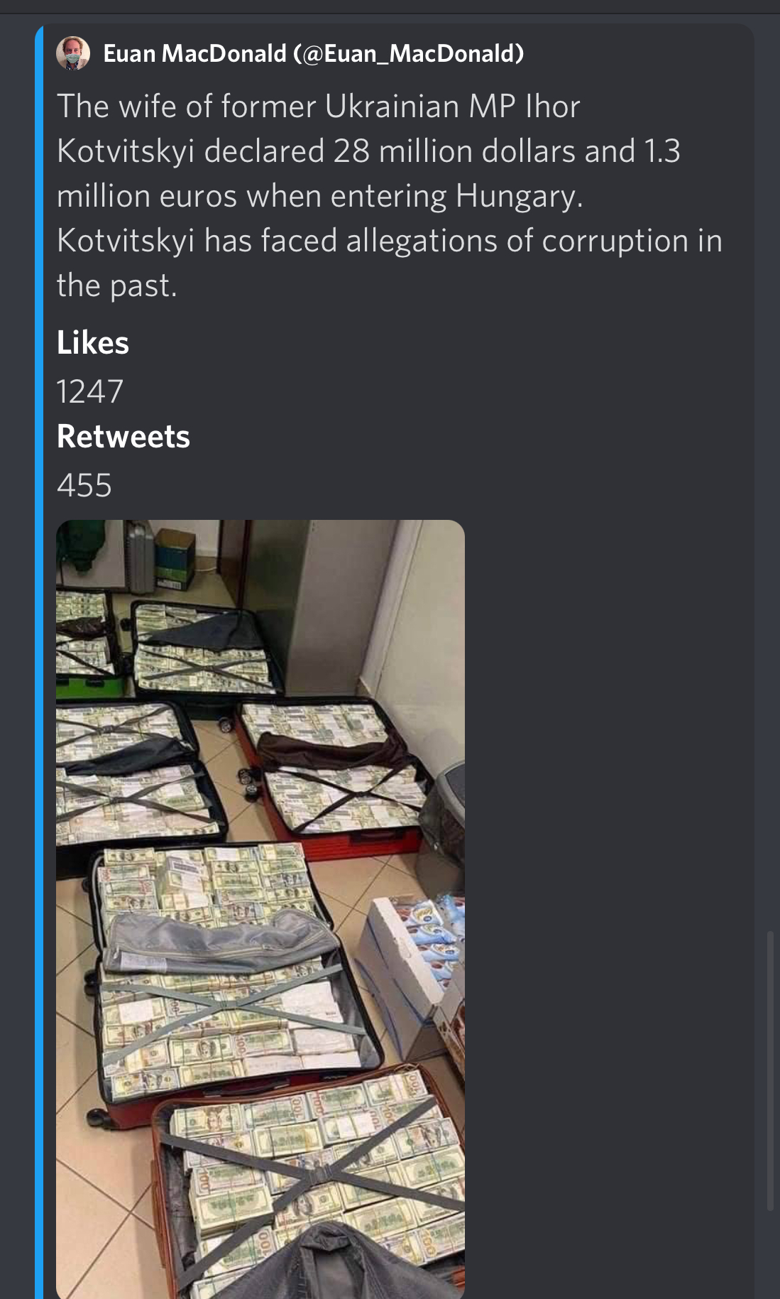 >>525848647How heavy is hundreds of millions of dollars?Its roughly 10 kilos in $100 notesSo we talking a couple of hundred kilos?And they have to go through baggage?