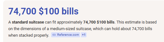 >>525852481>>5258534527 million in a single suit case would be 2 or 3 times the weight limit for check in bags