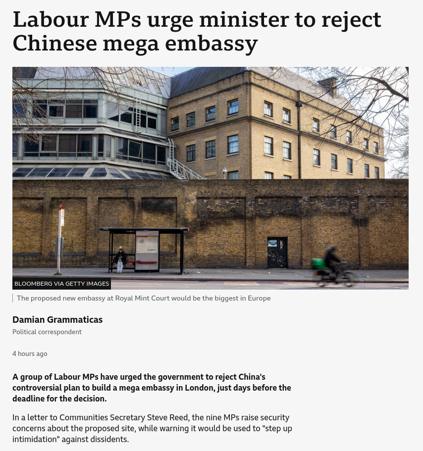 Should the UK approve this Chinese mega embassy?My view is no, because China clearly wants to spy on us as much as they canhttps://www.bbc.co.uk/news/articles/cdre527zymzo