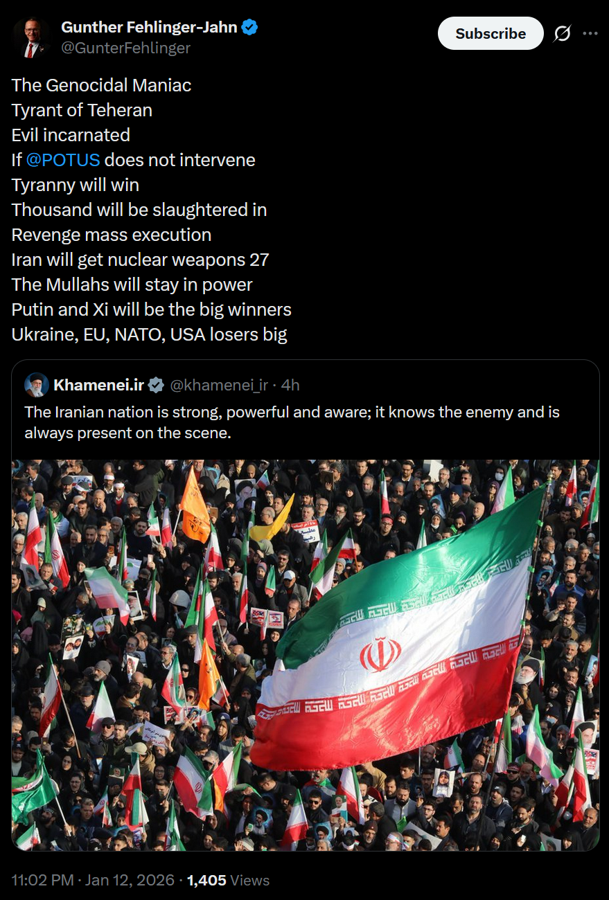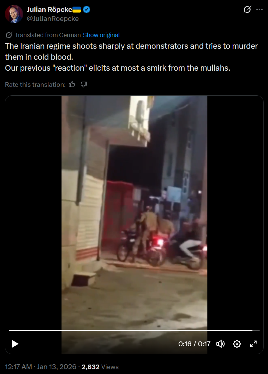 https://x.com/JulianRoepcke/status/2010838462631465429>The Iranian regime shoots sharply at demonstrators and tries to murder them in cold blood.>Our previous "reaction" elicits at most a smirk from the mullahs.