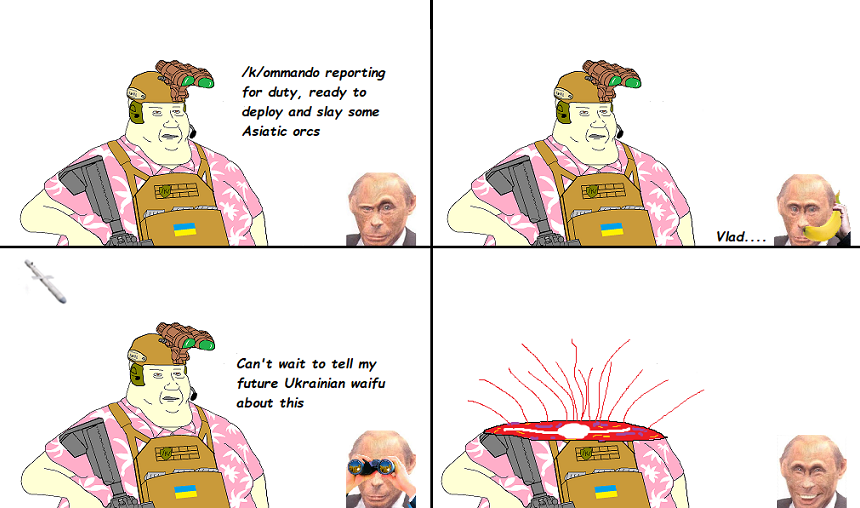 >>525855825>putin monke memes>prigozhin edits >marichka (swastika on titty)your options are straight to gulag or straight back to ukraine.Don't expect fsbros to know deepest meme lore.