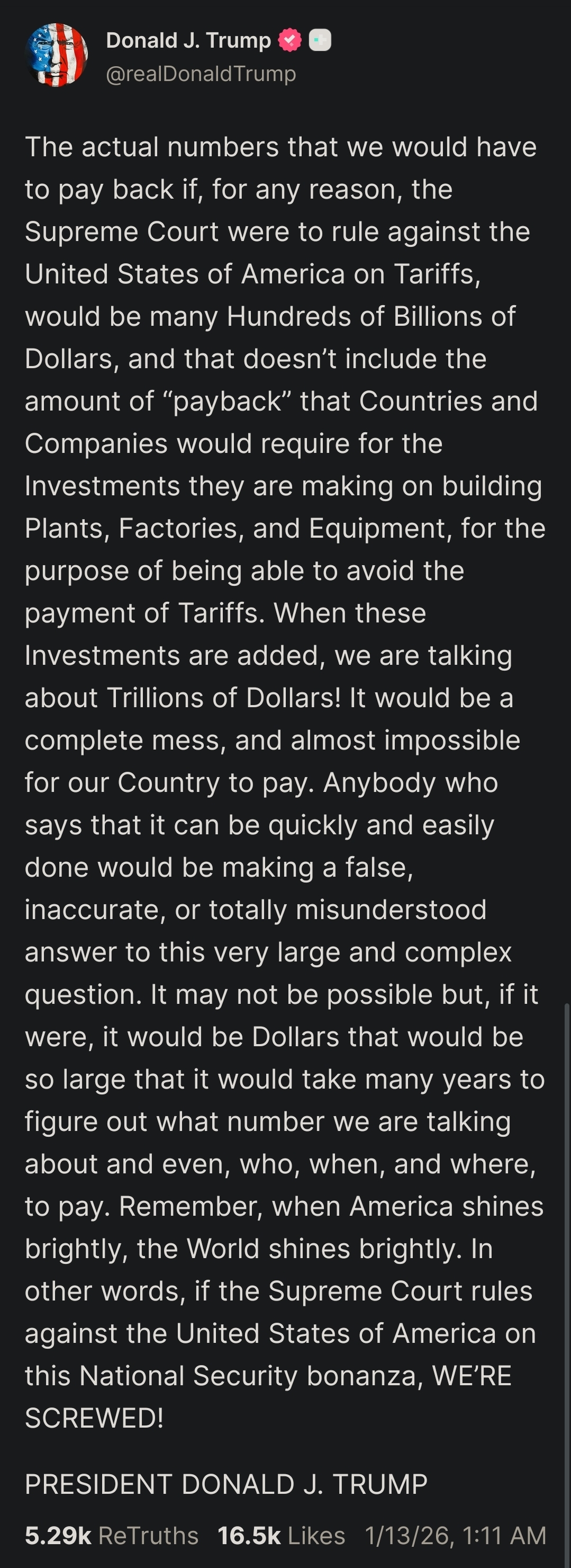 On the same fucking day he's crying that the supreme court is going to take his tariffs away because he bypassed congress.Take it from a brazilian, his tariffs don't mean shit.