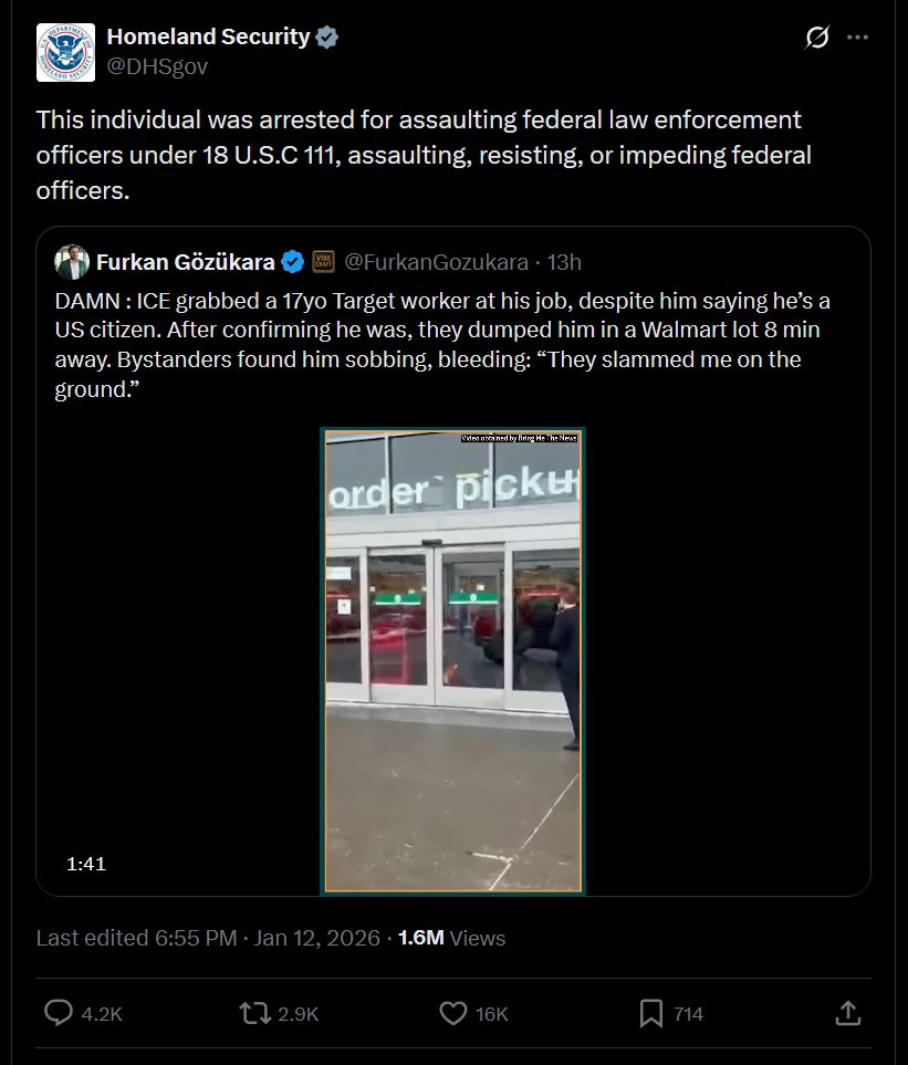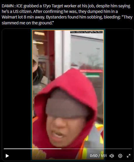 Ice went into target to take a shit recently. a nigger threatened them and they ignored the nigger https://x.com/mattmfm/status/2010784361688228011?s=46 they arrested a 17 year old white male working at a cash register. They hurt him to the point he was bleeding then dropped him off at another shop when realising he was innocent https://x.com/furkangozukara/status/2010654293393821894?s=46