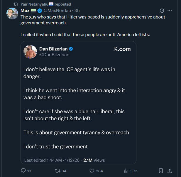 The guy who says that Hitler was based is suddenly apprehensive about government overreach.I nailed it when I said that these people are anti-America leftists.https://x.com/MaxNordau/status/2010786916879503849