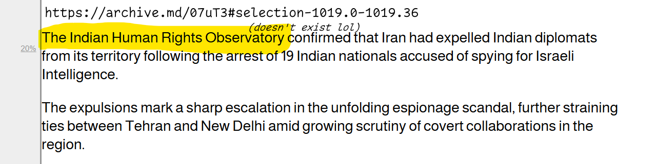 >>525855534>Is the Iranian government prohibiting entrance of visa-free Indians good enough for you?To prove that Indians were SPYING FOR ISRAEL? Are you nuts? >The author was referencing the organisation called "Legal Rights Observatory", which is associated with the Hindu nationalist group called "Rashtriya Swayamsevak Sangh".No. Picrel the article cites "Indian Human Rights Observatory" an organisation that shows no sign of existinghttps://archive.md/07uT3#selection-1019.0-1019.36>Are you satisfied now? I guess you're not, since I just nipped at the bud one of the "gotchas" that you tried to pull out of thin air as an attempt to discredit the report on Indians spying for jews.what? you can't even get the name of the organisation right. The article you cite says "Indian Human Rights Observatory" not "Legal Rights Observatory" >And last but not least, here's the /cig/ post from July 7th that I first referenced last thread.It's literally the same bullshit article that relies on twitter accounts (including one clearly pseudonymous one) and an org that doesn't exist for its sources. And /cig/ is a spam-posting content farm Telegram channel that posts over a hundred articles a day, not some Socratic oracle of investigative journalism. You have nothing, certainly not anything showing any Indian was convicted by Iran for spying for Israel. Your entire story depends on "Iran hushed it up" (why? how?) and "I remember seeing it trust me bro".I'm going to sleep. No doubt you'll come back with some smart quip but just like you would pause before jumping to conclusions about some guy accused of racism or rape, it'll be useful if you could show basic levels of civilised behaviour and probity before accusing Indians of spying for the Zionists, something far worse than rape. Our poor may shit in the streets still, our children die of tainted water and Delhi air is polluted af but no Indian was found guilty last year of spying against Iran for the Jews.