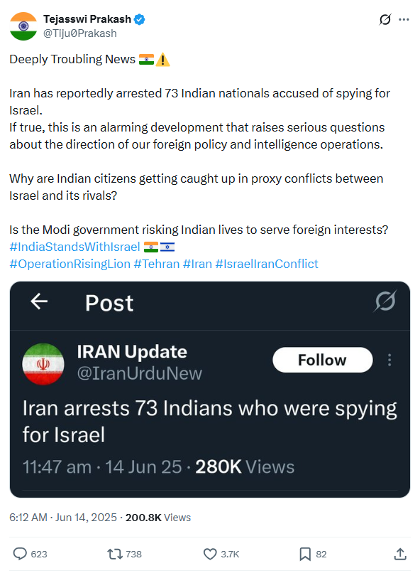 >>525858594>To prove that Indians were SPYING FOR ISRAEL?Yes. Among other things, like pic related — which you conveniently ignored, like everything else in that article, other than the human rights org name that the guy got wrong, and the fact that it's a Muslim writing.>No. Picrel the article cites "Indian Human Rights Observatory">you can't even get the name of the organisation rightHe mistook the name of a human rights organisation that advocates for Indians. How was that not clear for you?>It's literally the same bullshit article that relies on twitter accountsWhy are you being so dismissive about a long article filled with sources such as the Financial Times and a lot of history cited about pacts between India and Israel?You don't want to believe it and drink pure unadultered copium? Fine, but at least do it with dignity, instead of grasping at straws about Pakis, Muslims, "just twitter accounts" (which happen to be Hindu nationalists complaining about Iran detaining Indians June-July, btw).And it's not "my story" or "I remember seeing it". I showed it to you, only for you to cope with a lot of desperation-stricken "lol" comments, and feeble attempts to discredit even both countries embassies and Hindu nationalists complaining about arrested Indians and Indians getting prohibited to enter Iran, when everyone else was laughing at the obvious fact that Mossad employed Indians in their spy networks, and that the "kidnappings" were merely the families losing contact after Iranian military arresting them in a country with low communication and low press. You coped even about Indians allegedly not going to Iran, or their families making a fuss. Absolute desperation. Just stop it.