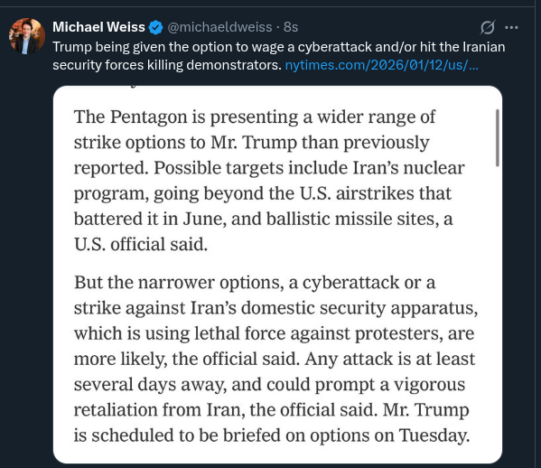>The Pentagon presented President Trump with a wider range of strike options for Iran than previously reported; targets could even include nuclear sites and ballistic missile bases and factories>The most likely options remain cyberattacks or military strikes against the Iranian domestic security apparatus that is 'suppressing protesters' – NYT