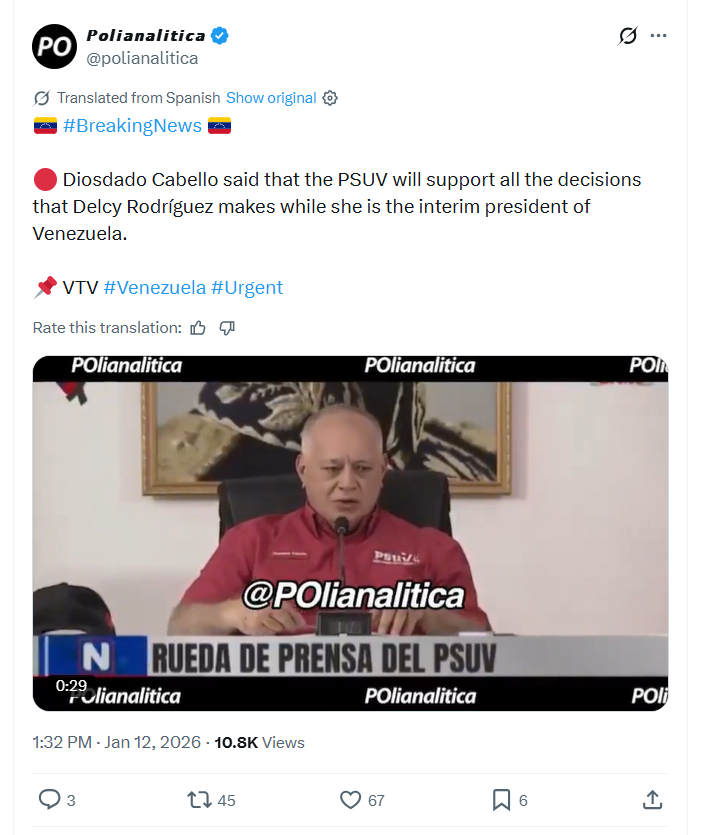 #BreakingNews Diosdado Cabello said that the PSUV will support all the decisions that Delcy Rodríguez makes while she is the interim president of Venezuela. VTV #Venezuela #Urgent 1/12/2026https://x.com/polianalitica/status/2010782008549736890 1/12/2026https://files.catbox.moe/lqog86.mp4