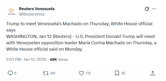 Trump to meet Venezuela's Machado on Thursday, White House official saysWASHINGTON, Jan 12 (Reuters) - U.S. President Donald Trump will meet with Venezuelan opposition leader Maria Corina Machado on Thursday, a White House official said on Monday. 1/12/2026 https://x.com/ReutersVzla/status/2010789166054023641