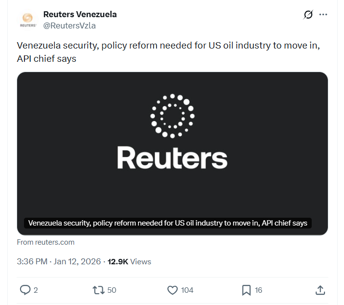 Venezuela security, policy reform needed for US oil industry to move in, API chief says 1/12/2026https://x.com/ReutersVzla/status/2010813076950393185