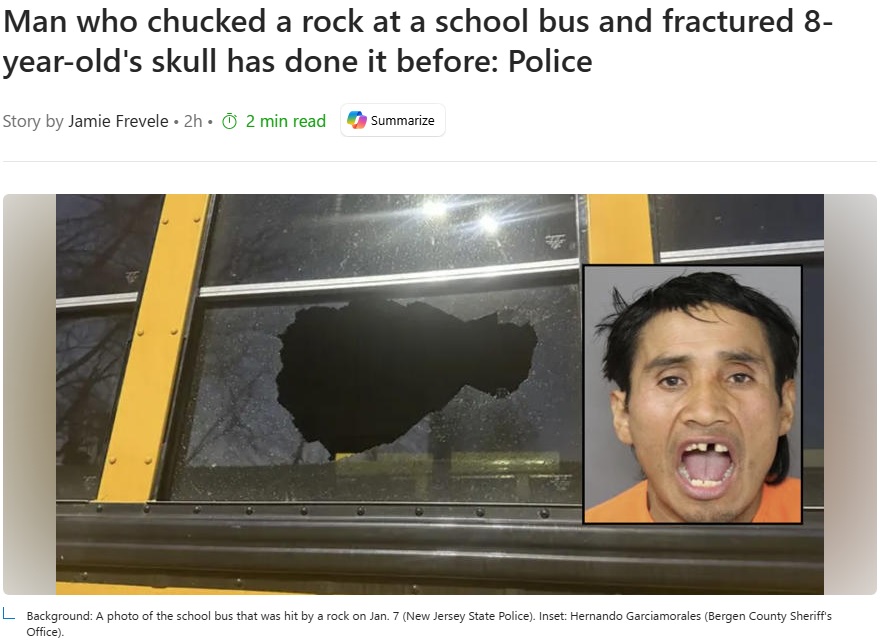 https://www.msn.com/en-us/news/crime/man-who-chucked-a-rock-at-a-school-bus-and-fractured-8-year-old-s-skull-has-done-it-before-police/ar-AA1U4EVzWhat is wrong with people in this country. Another insane American went around throwing rocks at school buses and was finally arrested and stopped after fracturing a child's head.