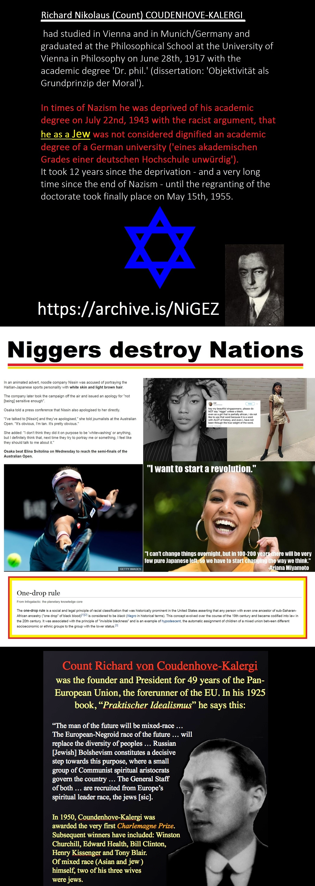 >>525876905Absolutely abhorrent pilpulYou can't even prove, that Kalergi wanted to mix people specifically with niggers.What obviously happened is that he was an outcast in a White society, so he became anti-Whie and pro-race mixing as a result (so he wouldn't be an outcast) and met kikes with the same ideas (except the hatred against kikes is due to their maliciousness and parasitism, which they will never admit)