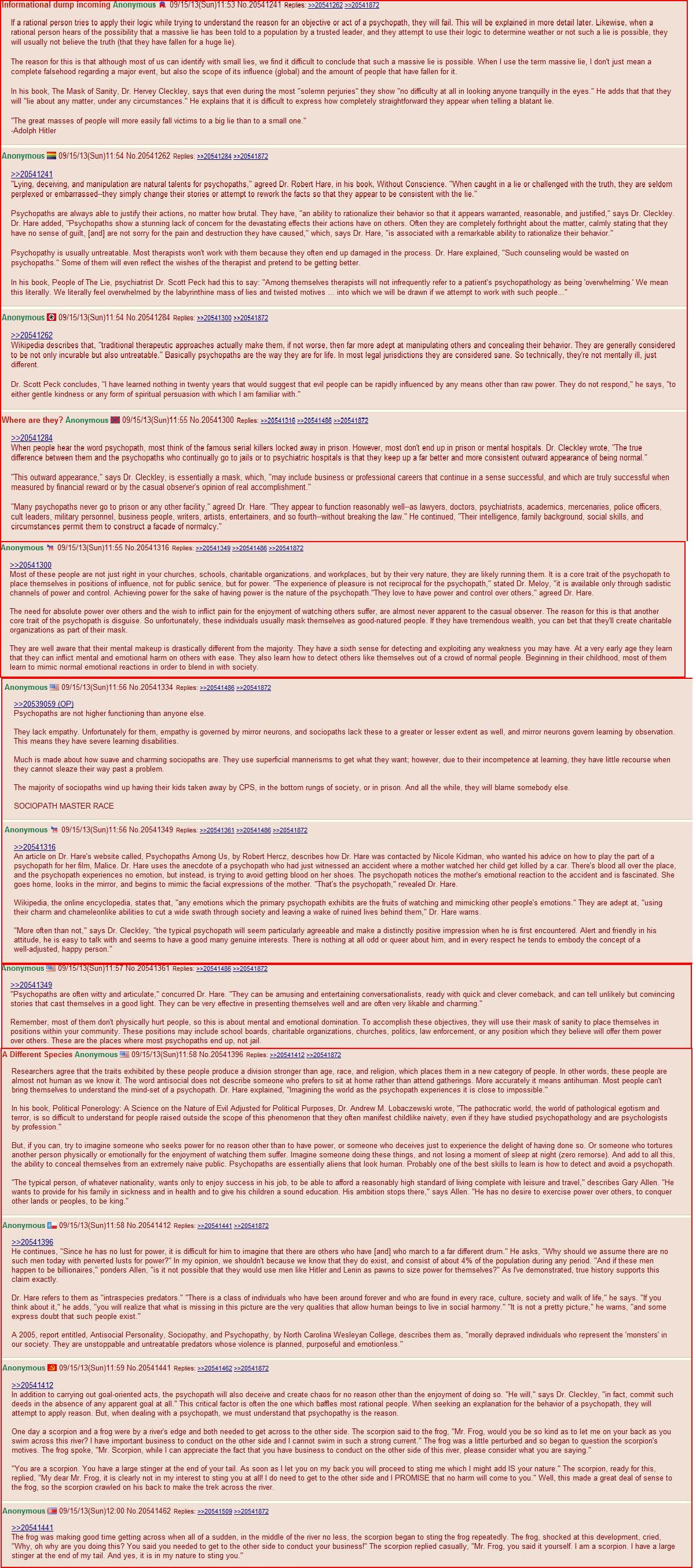 >>525868694But most "functional" ones are not very good people, as you can imagine, and cause a lot of damage to the families, organizations and societies they are a part of.The rate of psychopathy in the general population is estimated to be about 1-2% (it probably varies, perhaps a lot, by race). This may be underestimating by a bit because it is more focused on "dysfunctional psychopaths", so it could be more like 2-3.5% perhaps. However, psychopaths commonly tend to like certain things - which make them tick, which gives them drive to "fit in" in order to gain their dopamine. One of those things is power and control, another is money, and another is all of the above combined in amounts that give them the ability to do to others as they wish with legal and/or social impunity.This leads to the "functional psychopaths" filtering into positions within society that grant them these desires. We can estimate that the rate of psychopathy in positions of power and influence within society is several times higher than in the general populace - and worse, they are almost all the much more "functional" type so they go unnoticed or even admired and respected by the unaware. In fields like politics (especially), business, medicine, law, even academics (perhaps also especially nowadays), and similar, we can estimate the rate of psychopathy is more likely to be at least 10% and in some cases more like 15-20%.Continued