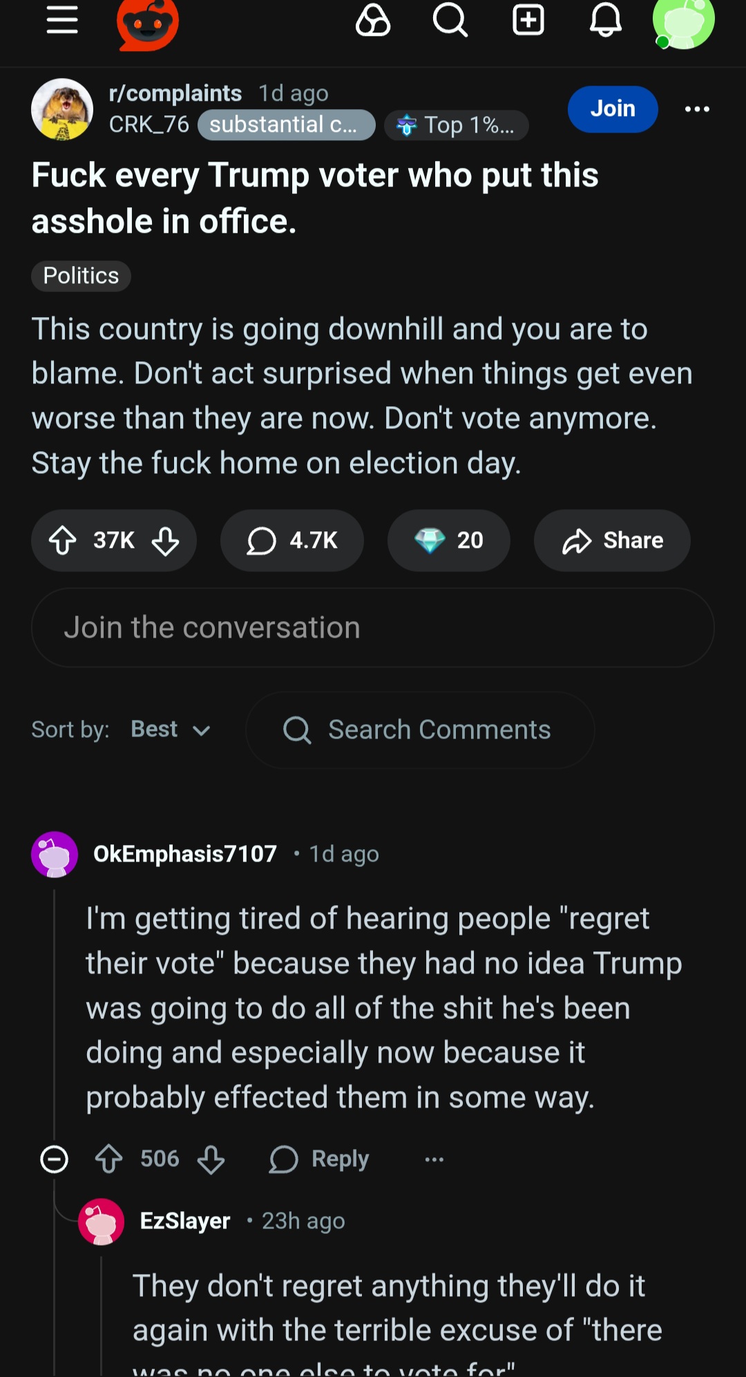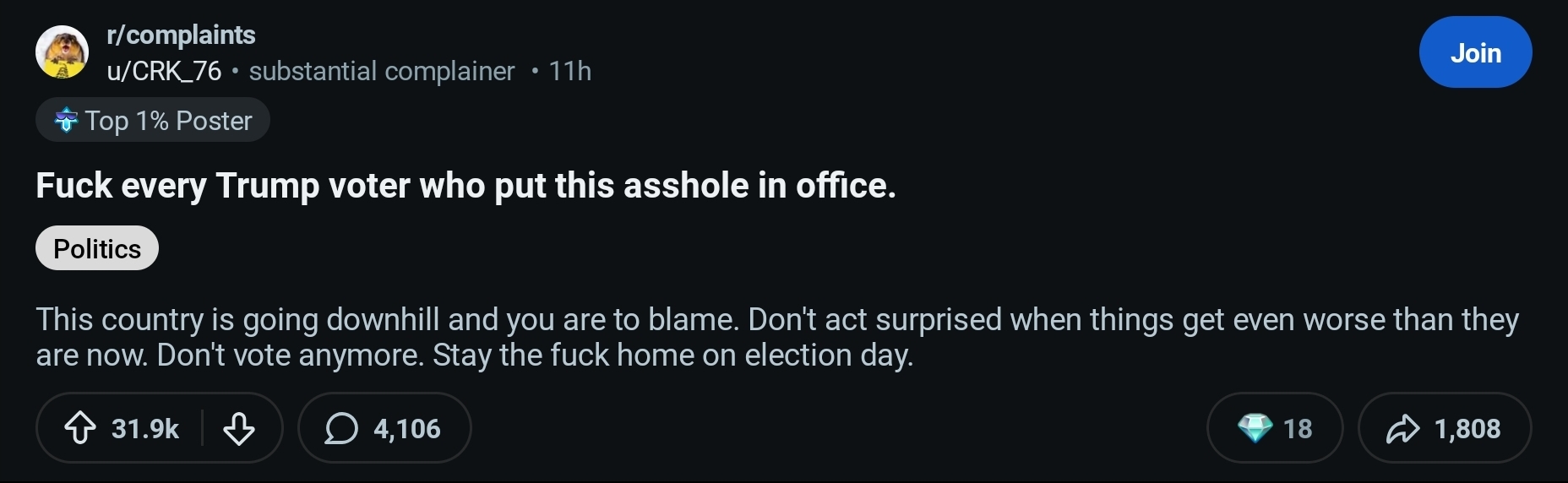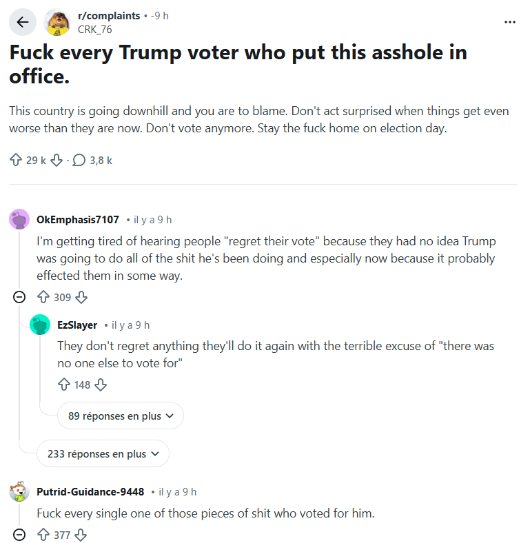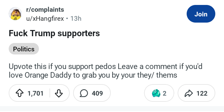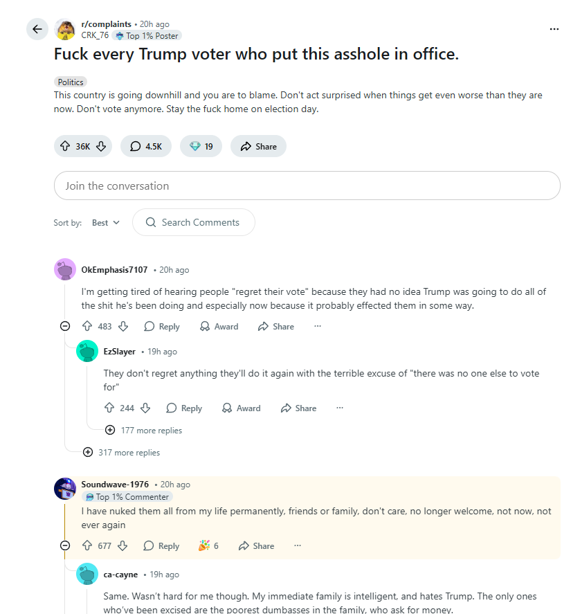>>525917066ope wrong link and forgot image:https://www.reddit.com/r/complaints/comments/1qb2ik9/fuck_every_trump_voter_who_put_this_asshole_in/op is LYING