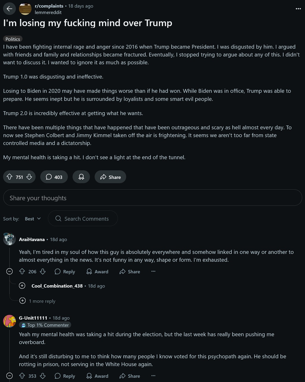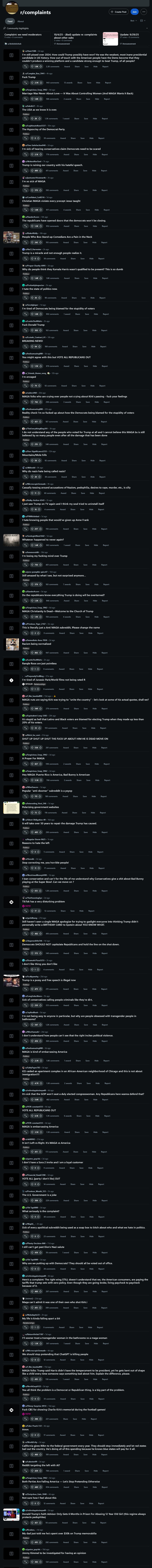 >>525870974crazy how 90% of the posts on r/complaints are liberals seethinghttps://www.reddit.com/r/complaints/