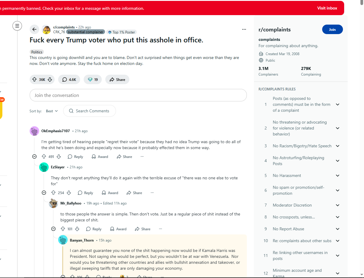 that has to be fake i got permabanned and 20 accounts IP banned for posting 1/9999999 of those comments. Getting IP banned was the best thing that happened to me I used to legit seethe that whole website is a leftist soapbox. They ruined all the music movies video games and tv show subreddits. It was cool to talk about sopranos on there until every sopranos subreddit turned it to politics.