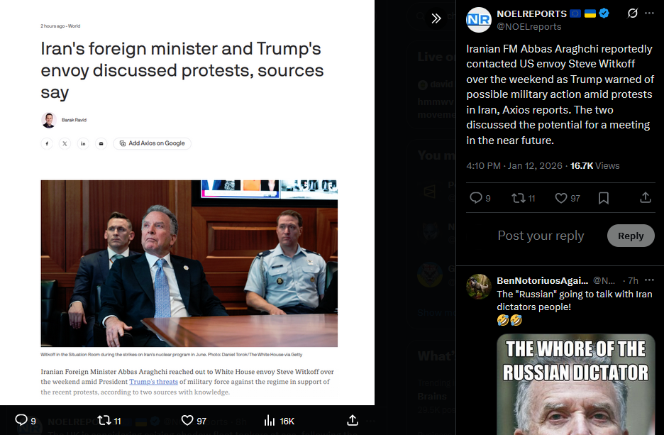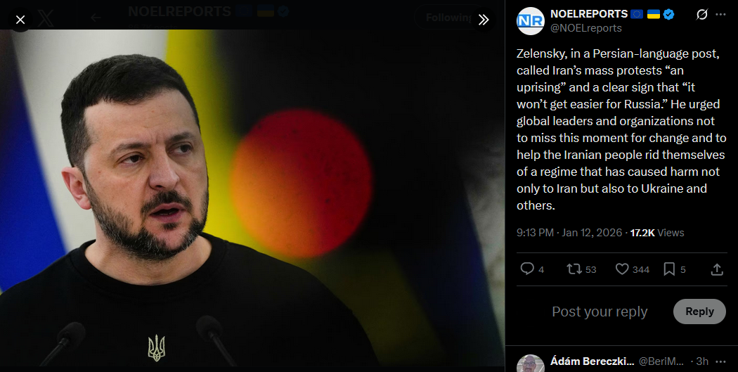 >>525888984Zelensky, in a Persian-language post, called Iran’s mass protests “an uprising” and a clear sign that “it won’t get easier for Russia.” He urged global leaders and organizations not to miss this moment for change and to help the Iranian people rid themselves of a regime that has caused harm not only to Iran but also to Ukraine and others.https://x.com/NOELreports/status/2010822485126889559?s=20>12h