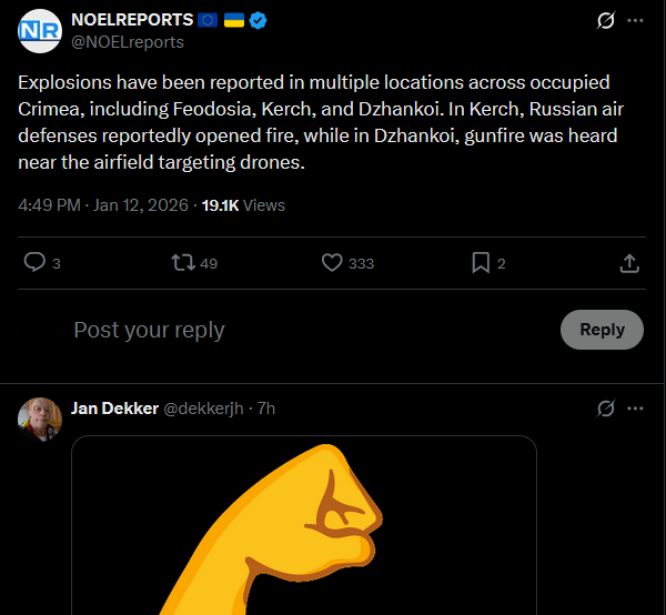 A missile and drone threat is declared in occupied Crimea. Explosions have already been reported near Saky airfield.https://x.com/NOELreports/status/2010426013269066172?s=20>11th