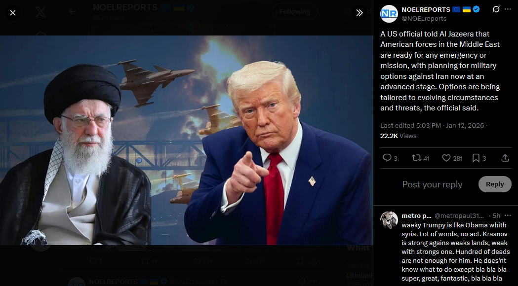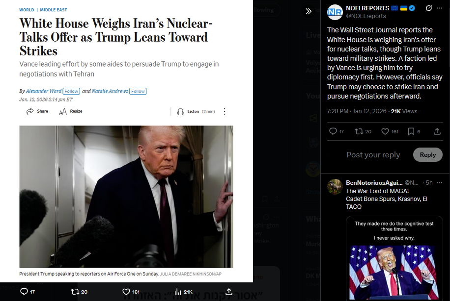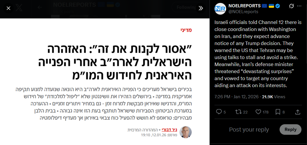 Trump is “seriously inclined” to assist Iranian protesters, sources tell the Jerusalem Post. Options on the table include cyberattacks, military strikes, and deploying Starlink. Israel has opted not to intervene publicly, while Netanyahu condemned the regime's crackdown and voiced support for the protest movement.https://x.com/NOELreports/status/2010444731679953010?s=20>11th