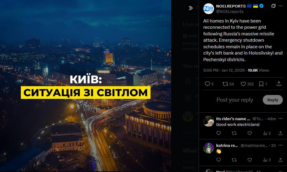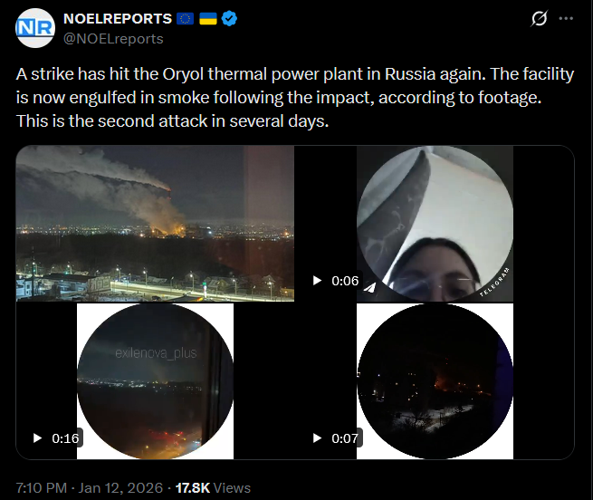 Zelensky says government and regional teams spent the day focused on restoring electricity, heating and infrastructure after recent Russian strikes. Repair crews, emergency services and state companies are working across Kyiv, Dnipropetrovsk, Zaporizhzhia, Kharkiv and Donetsk regions, despite severe winter weather. He thanked every worker helping to bring life back to normal for families still without power.https://x.com/NOELreports/status/2010425018472116705?s=20>11th