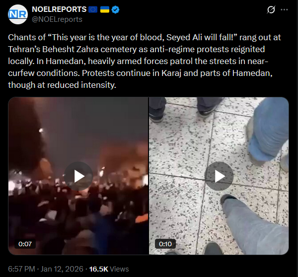 >>525885952The Iranian regime has declared three days of public mourning for those killed during the protests, who were shot by government forces themselves. State media, official SMS broadcasts and TV channels are pushing the narrative that “American and Israeli terrorists are responsible for the deaths,” effectively co‑opting the victims to fit regime propaganda.https://x.com/NOELreports/status/2010463774788956320?s=20>11th