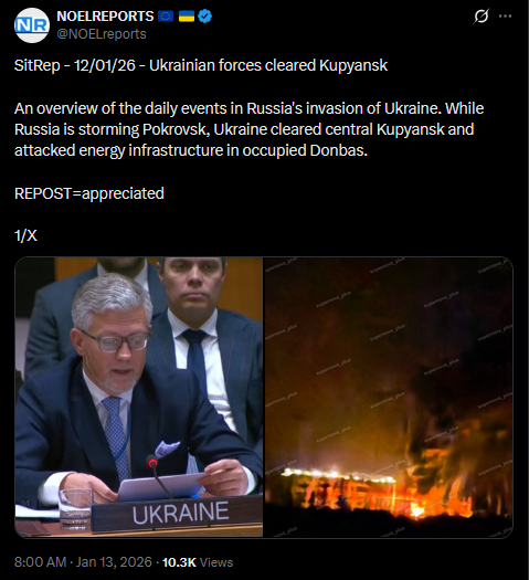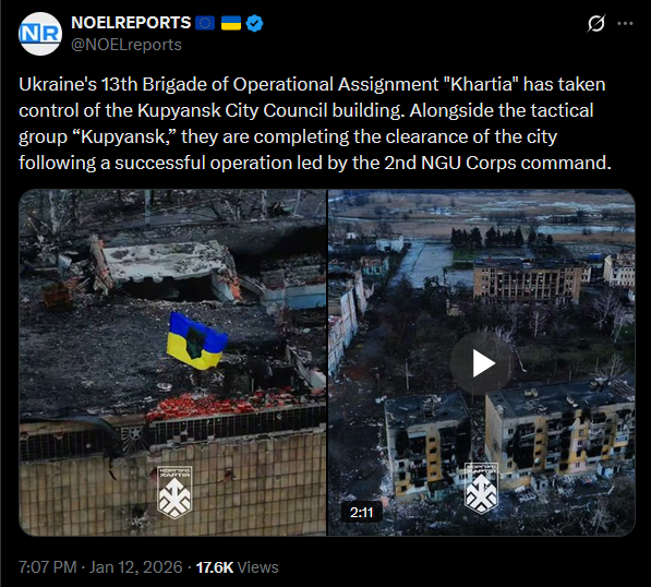 >>525889669 Hey Anon ^_^SitRep - 12/01/26 - Ukrainian forces cleared KupyanskAn overview of the daily events in Russia's invasion of Ukraine. While Russia is storming Pokrovsk, Ukraine cleared central Kupyansk and attacked energy infrastructure in occupied Donbas.https://x.com/NOELreports/status/2010985355068260687?s=20
