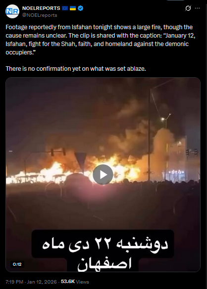 >>525885382Protests continue across Iran tonight. In Shahsavar and Khorramabad, demonstrators have taken to the streets. In Tehran, large crowds are once again marching despite the violent crackdown. In Kermanshah, protesters reportedly set fire to a building used by Islamic Republic security forces.https://x.com/NOELreports/status/2010445823843123685?s=20>11thvideo 1https://files.catbox.moe/vuyngq.mp4video 2https://files.catbox.moe/8dw0zk.mp4video 3https://files.catbox.moe/2srapc.mp4