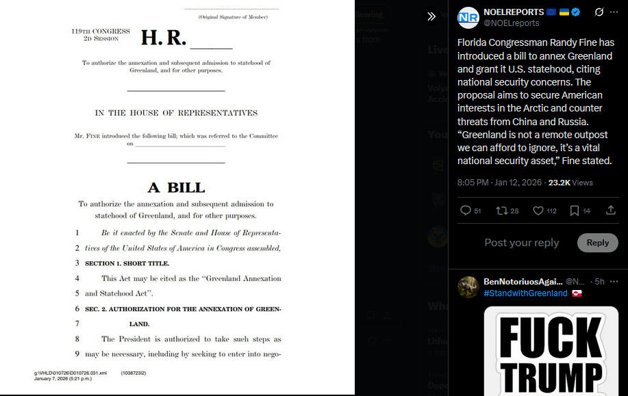 Florida Congressman Randy Fine has introduced a bill to annex Greenland and grant it U.S. statehood, citing national security concerns. The proposal aims to secure American interests in the Arctic and counter threats from China and Russia. “Greenland is not a remote outpost we can afford to ignore, it’s a vital national security asset,” Fine stated.https://x.com/NOELreports/status/2010805412866695504?s=20>13h