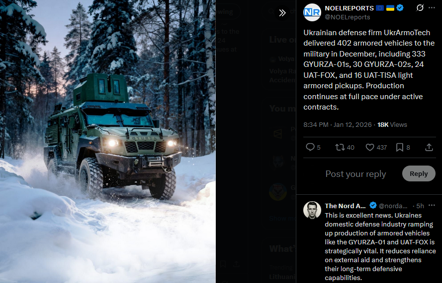 Ukrainian defense firm UkrArmoTech delivered 402 armored vehicles to the military in December, including 333 GYURZA-01s, 30 GYURZA-02s, 24 UAT-FOX, and 16 UAT-TISA light armored pickups. Production continues at full pace under active contracts.https://x.com/NOELreports/status/2010812603463778662?s=20>13h