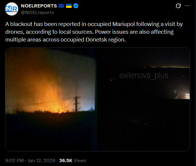>>525882628A blackout has been reported in occupied Mariupol following a visit by drones, according to local sources. Power issues are also affecting multiple areas across occupied Donetsk region.https://x.com/NOELreports/status/2010819816261652774?s=20>12hpic 1https://files.catbox.moe/i5v1om.jpgpic 2https://files.catbox.moe/871j3z.jpgpic 3https://files.catbox.moe/ghqczk.jpg
