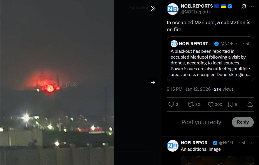 >>525889126>In occupied Mariupol, a substation is on fire.An additional imagehttps://x.com/NOELreports/status/2010823263857902058?s=20
