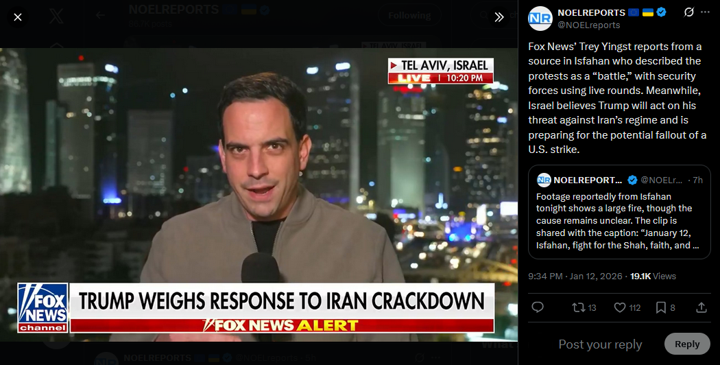 >>525888690Fox News’ Trey Yingst reports from a source in Isfahan who described the protests as a “battle,” with security forces using live rounds. Meanwhile, Israel believes Trump will act on his threat against Iran’s regime and is preparing for the potential fallout of a U.S. strike.https://x.com/NOELreports/status/2010827630505873590?s=20>12h
