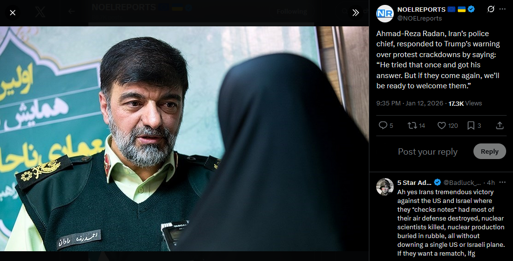 >>525889203Ahmad-Reza Radan, Iran’s police chief, responded to Trump’s warning over protest crackdowns by saying: “He tried that once and got his answer. But if they come again, we’ll be ready to welcome them.”https://x.com/NOELreports/status/2010828053811761529?s=20>12h