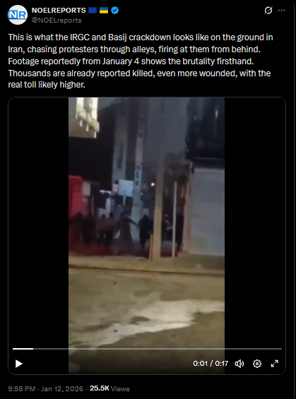>>525889272This is what the IRGC and Basij crackdown looks like on the ground in Iran, chasing protesters through alleys, firing at them from behind. Footage reportedly from January 4 shows the brutality firsthand. Thousands are already reported killed, even more wounded, with the real toll likely higher.https://x.com/NOELreports/status/2010833718622175527?s=20https://files.catbox.moe/pldomt.mp4>>525889279 trump doesn't give a fuck about people being killed, America is broke, russia is already broke, Iran is broke, and China will be broke, it's a new world