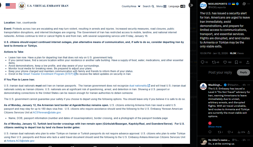 >>525889433The U.S. has issued a security alert for Iran. Americans are urged to leave Iran immediately, avoid demonstrations, and prepare for limited access to communications, transport, and essential services. Flights are disrupted, and land routes to Armenia or Türkiye may be the only viable exits.https://x.com/NOELreports/status/2010835890956886086?s=20>12h