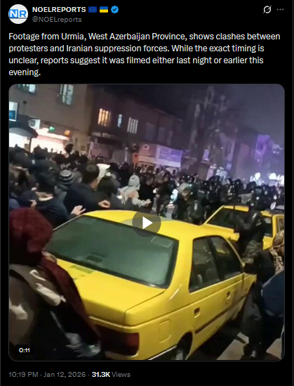 >>525889466Footage from Urmia, West Azerbaijan Province, shows clashes between protesters and Iranian suppression forces. While the exact timing is unclear, reports suggest it was filmed either last night or earlier this evening.https://x.com/NOELreports/status/2010839029911085409?s=20>11hhttps://files.catbox.moe/z4sodl.mp4>>525889470 are you missing Prigo now? shame