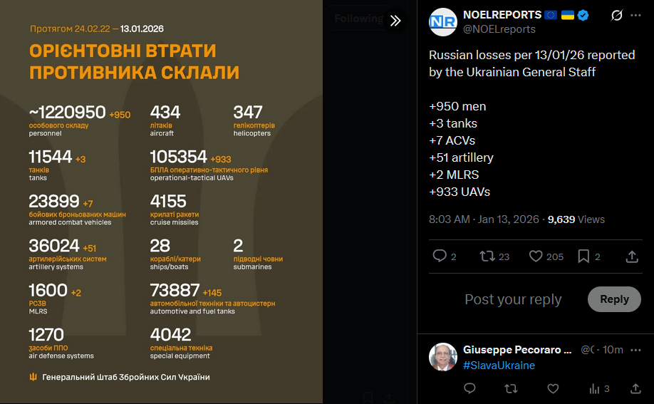 >>525882628Russian losses per 13/01/26 reported by the Ukrainian General Staff+950 men+3 tanks+7 ACVs+51 artillery+2 MLRS+933 UAVshttps://x.com/NOELreports/status/2010986066736791964?s=20
