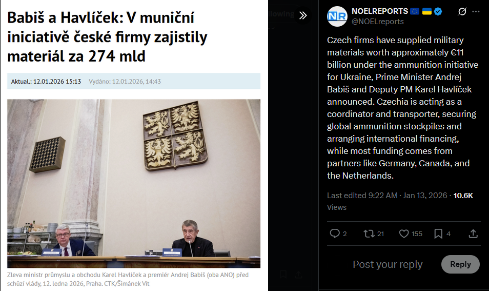 Czech firms have supplied military materials worth approximately €11 billion under the ammunition initiative for Ukraine, Prime Minister Andrej Babiš and Deputy PM Karel Havlíček announced. Czechia is acting as a coordinator and transporter, securing global ammunition stockpiles and arranging international financing, while most funding comes from partners like Germany, Canada, and the Netherlands.https://x.com/NOELreports/status/2011005976200073612?s=20>>525890510 thank you anon