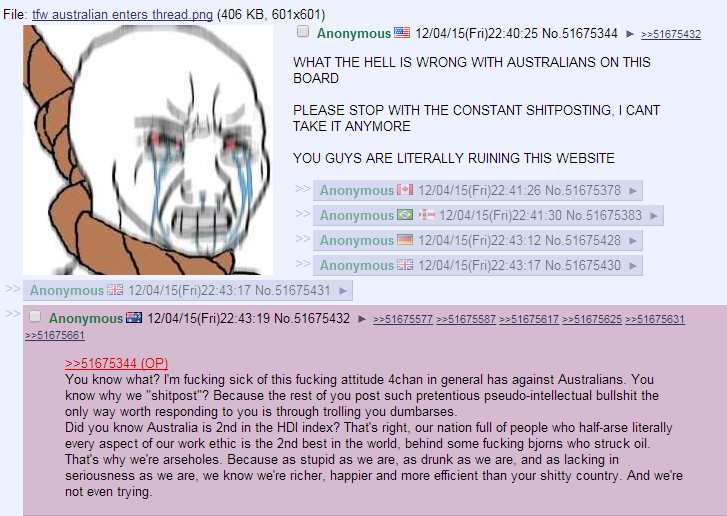 You're a bunch of fucking idiots. Your whole country is full of apathetic beach bums. Bunch of fucking cucks too. You let your women dictate every aspect of your lives. And your women are massive stupid annoying cunts as well. With that stupid fucking accent "all hoorighhht" Go fuck yourself.