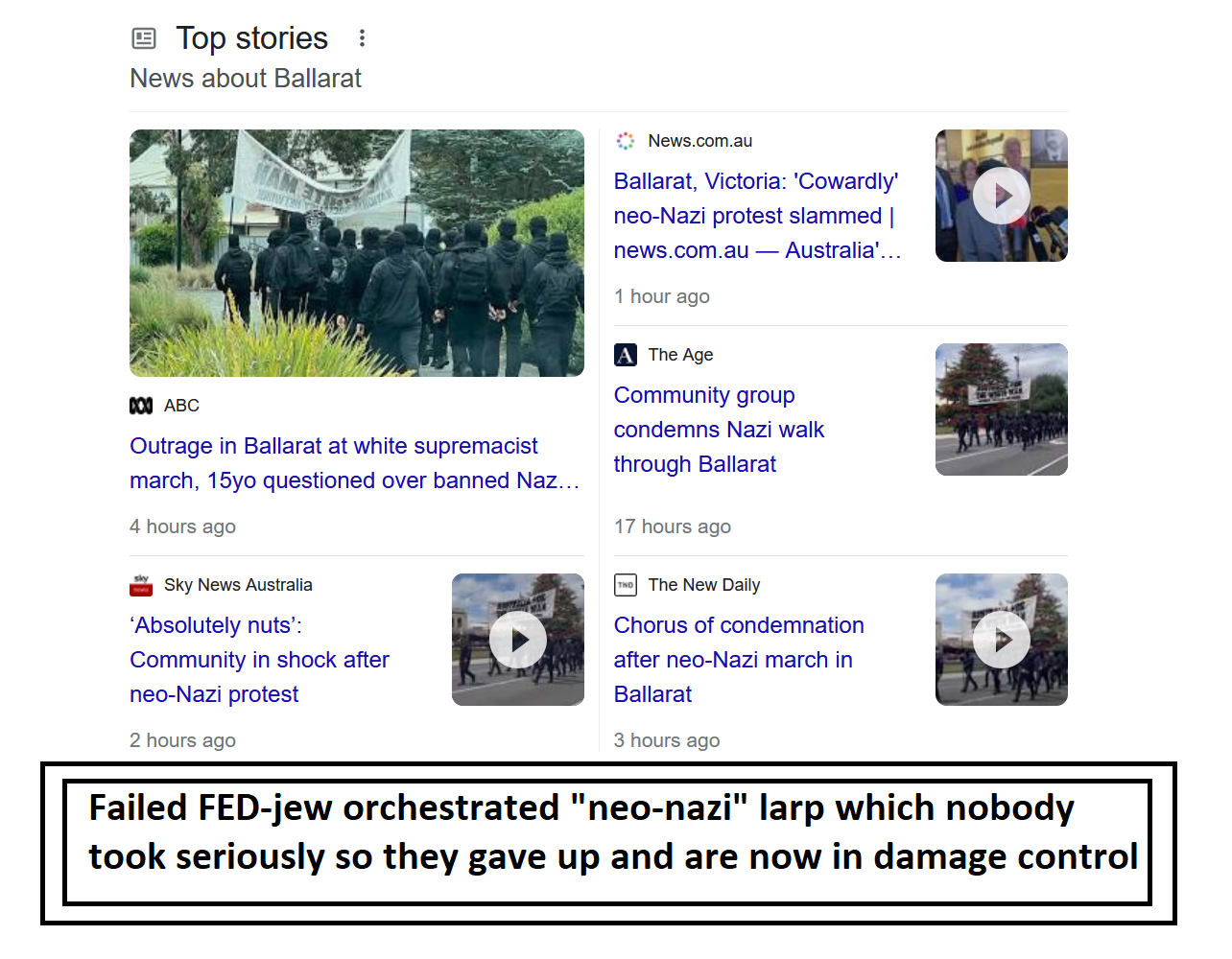 >Australia never had issues with 'nazis' and similar til jewish groups recently secured government and non government funding to troll via the media and claim 'nazis' area problem Never heard of a nazi issue before that in Australia, the world's greatest nation>It's always zionist propagandists promoting garbage that turns back against themWhat do you think is the root cause of alleged "anti-semitism"?>Surely it's not the "semites" themselves, right?Every single day now there's another fake news propaganda story regarding a jew, or a (((nazi)) or so on, it's out of control, and nobody cares>This is Australia, keep your gay propaganda outDon't like it, leave it