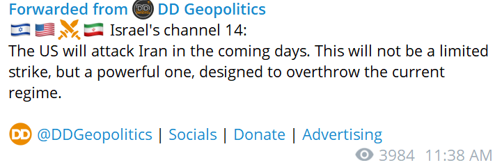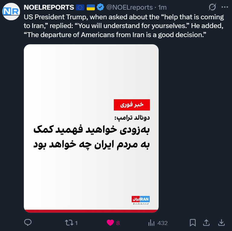 Last: >>525897823Daily discussion of the ongoing situation in Iran.Jan 13:>No water and power>Trump: I have cancelled all meetings with Iranian Officials until the senseless killing of protesters STOPS. HELP IS ON ITS WAY. MIGA... PRESIDENT DONALD J. TRUMPJan 12:>internet still blocked after 100+ hours>Heavy govt crackdown in Isfahan tonight, live ammunition being used - FOX>Trump leaning towards military strikes, with Vance leaning towards talks - WSJ>protests again tonight in Tehran>pro-govt rallies were organized todayJan 11 and before:>protests have reached over 180 cities total>every major city has or is experiencing protests>Lowshan was "in the hands of the people" until yesterday when the military showed up in force and violently dispersed the protests -BBC Persian>at least 500+ dead according to activists - AP>estimated thousands of protestors dead, unverified source says over 20k likely dead>dozens of police dead during clashes, Islamic regime using machine guns to surpress crowds>complete network blackout cell/internet>Govt is cracking down on satellites and starlink terminals.>Trump: Iran is starting to cross it [my red line]. There seems to be some people killed that aren't supposed to be killed.>Donald Trump to be presented with options on how to handle Iran on Tuesday - WSJhttps://xcancel.com/alexbward/status/2010381167246327854 (embed)>Israel is on high-alert for a US intervention possibly happening soonhttps://www.reuters.com/world/middle-east/israel-high-alert-possibility-us-intervention-iran-sources-say-2026-01-11/>no action yet, a complete silence and lack of credible info due to prolongued blackoutIran Newshttps://www.aparatchi.com/iran-live-tv/farsi-irib-tv/shabakeh-khabar-liveXitterhttps://truthsocial.com/@realDonaldTrumphttps://x.com/khamenei_irhttps://x.com/WW3_MonitorMapshttps://www.flightradar24.com/airport/thrhttps://iran.liveuamap.com/https://geoconfirmed.org/iran