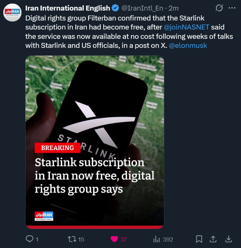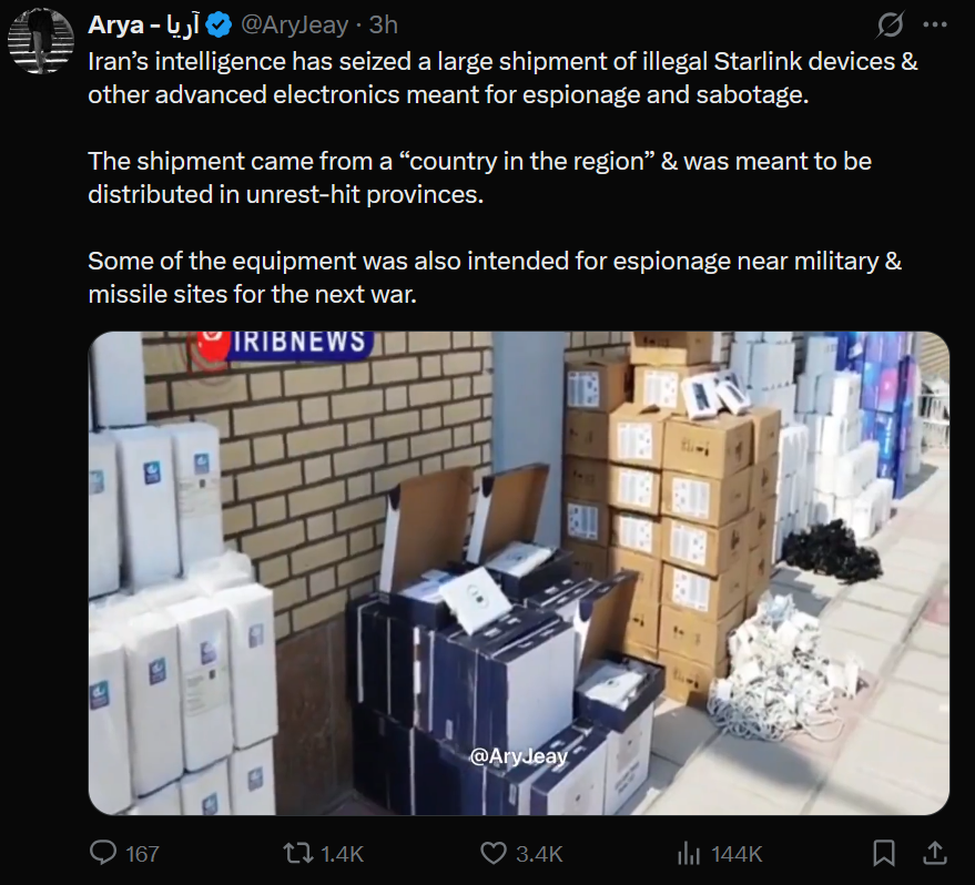 These threads would slightly improve if they weren't so blatantly biased in favor of the CIA op. Anyway here's something new>BREAKING >Iran has just announced the seizure of a huge shipment of Starlink>Since June 2025, possession of Starlink in Iran has been subject to espionage lawshttps://xcancel.com/IranObserver0/status/2011072515683029481