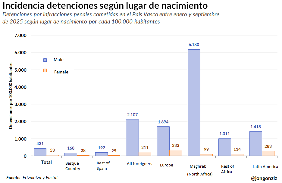 >>525917941The statistics are always worse than you think, even as a seasoned racist. This is data from the Basque Country police, from 2025. It's in Spanish but I think it's quite easy to understand the data, I translated the important stuff.Arrests for criminal offences by birthplace (not race, mind you!) per 100k. I'm surprised about the Europe number, but I suppose it includes mystery meat from all over the third world in there.
