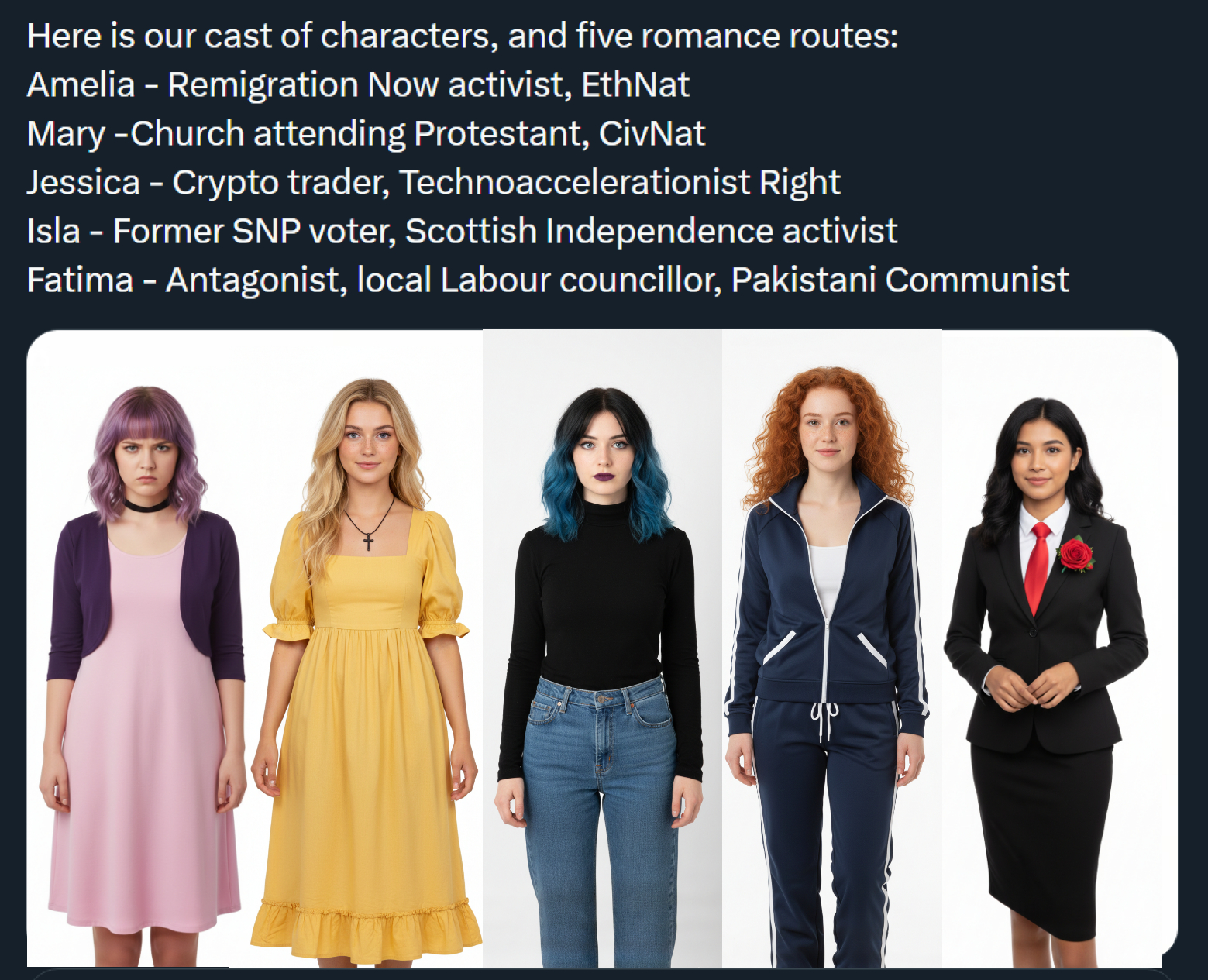 >>525921235Amelia is a recruiter with ulterior motives, Fatima is an useful idiot working for the establishment, the rest are honest to God idiot girls.
