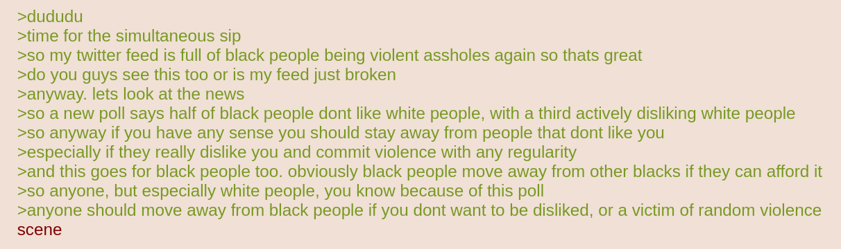 >dududu>time for the simultaneous sip>so my twitter feed is full of black people being violent assholes again so thats great>do you guys see this too or is my feed just broken>anyway. lets look at the news>so a new poll says half of black people dont like white people, with a third actively disliking white people>so anyway if you have any sense you should stay away from people that dont like you>especially if they really dislike you and commit violence with any regularity>and this goes for black people too. obviously black people move away from other blacks if they can afford it>so anyone, but especially white people, you know because of this poll>anyone should move away from black people if you dont want to be disliked, or a victim of random violencescene